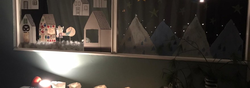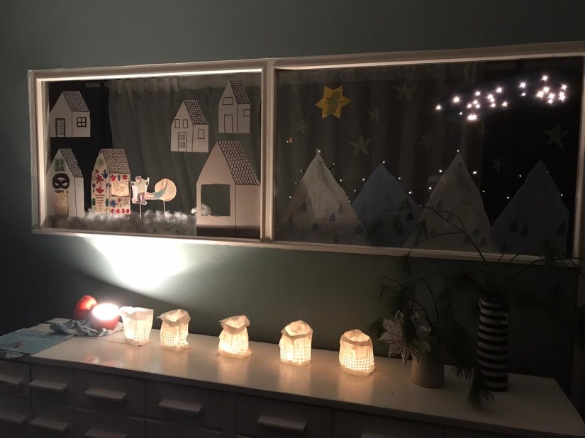 Eine besonders reizende Idee hatten Sophie Schäddel und Kristina sich für kleinere Kinder ausgedacht. In einer Art Schattenspiel erzählten sie die Geschichte „Wer hat den Schnee gestohlen“. Die Kinder hörten und schauten gespannt zu. Mit zarten