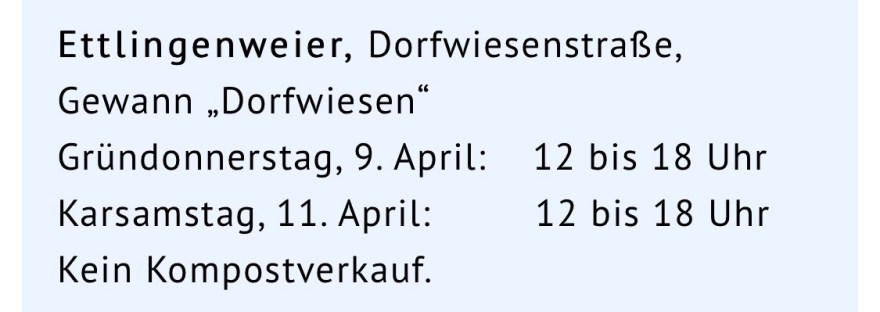 HÄCKSELPLATZ April 8, 2020 weierbloggt Diese Woche hat der Häckselplatz am Gründonnerstag und Karsamstag von 12-18 Uhr geöffnet. Letzte Woche hat es sehr gut geklappt. Dann sollten wir es auch diese Woche wieder mit Geduld und Disziplin hinbekommen. Frohe Ostern und bleibt alle gesund!! Teilen mit: Auf X teilen (Wird in neuem Fenster geöffnet) X Auf Facebook teilen (Wird in neuem Fenster geöffnet) Facebook Gefällt mir Wird geladen … Ähnliche Beiträge Veröffentlicht von weierbloggt Zeige alle Beiträge von weierbloggt