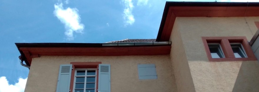 Auf der Ursachensuche wurde festgestellt, dass vielleicht die hintere Regenrinne schuld ist. Das Stück wurde gleich ausgetauscht. Nachdem das Zink etwas Patina angesetzt haben wird, kann es dann auch farblich passend gestrichen werden. Hoffen wir, dass es die Ursache war.