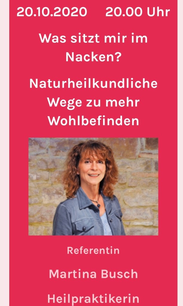 WEIERER SCHEUNE Oktober 20, 2020 weierbloggt Heute Abend: Was sitzt mir im Nacken? Naturheilkundliche Wege zu mehr Wohlbefinden Wieder 20 Uhr, wieder im Gemeindezentrum Teilen mit: Klicke, um auf X zu teilen (Wird in neuem Fenster geöffnet) X Klick, um auf Facebook zu teilen (Wird in neuem Fenster geöffnet) Facebook Gefällt mir Wird geladen … Ähnliche Beiträge Veröffentlicht von weierbloggt Zeige alle Beiträge von weierbloggt