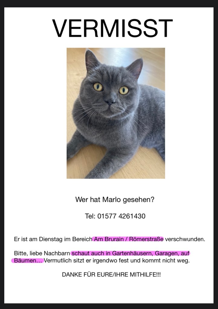 Vielen lieben Dank an alle, die beim Suchen geholfen haben und auch fürs Einstellen hier! Marlo ist wieder heil zuhause, nachdem er von einem Vordach gerettet werden musste. LikeLike Antworten