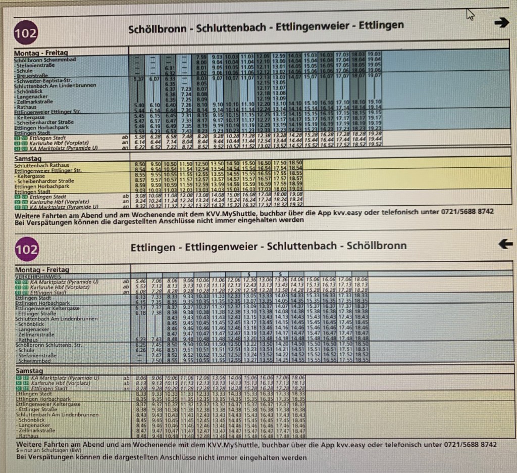 Seit dem Wochenende wurden die Busfahrten der Linie 102 am Abend reduziert: montags bis freitags ab 19 Uhr sowie sonntags ganztägig entfallen die Fahrten. Der Bedarf soll durch den MyShuttle Service (der Abholer vom KVV) abgedeckt werden. Die App kann im App Store oder bei Google Play runtergeladen werden.