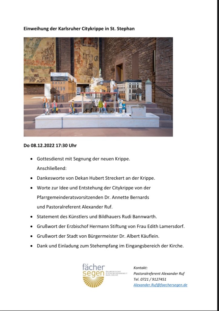 In Zusammenarbeit mit dem Weirer Künstler Rudi Bannwarth haben die Ökumenische Citykirchenarbeit „fächersegen“ und das Gemeindeteam St. Stephan die weihnachtliche Krippenszene ins Karlsruhe des Jahres 2022 transformiert. Die „Karlsruher Citykrippe“ mit 30 Zentimeter großen Holzfiguren ist vom 8. Dezember bis 8. Januar in der Citykirche St. Stephan zu sehen. Da steht Maria an der Straßenbahnhaltestelle neben einem KSC-Fan, Josef neben einer Krankenschwester.