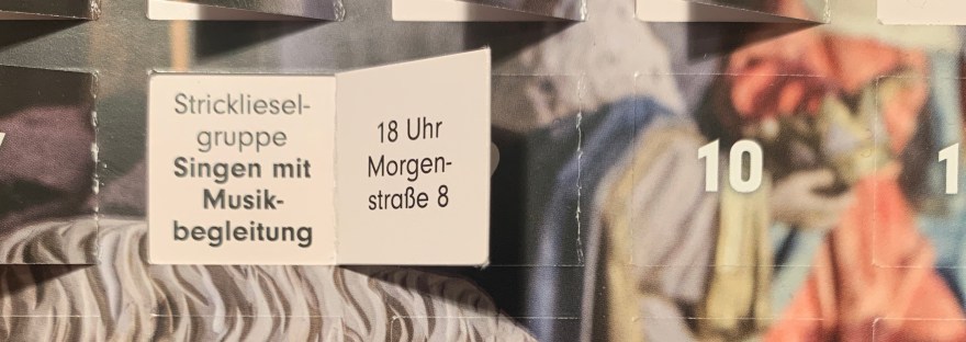 Um 18 Uhr lädt uns die Strickliesel Gruppe (begeisterte StrickerInnen, die sich immer donnerstags im Rathaus treffen) in die Morgenstraße 8 zum gemeinsamen Singen mit Musikbegleitung ein.