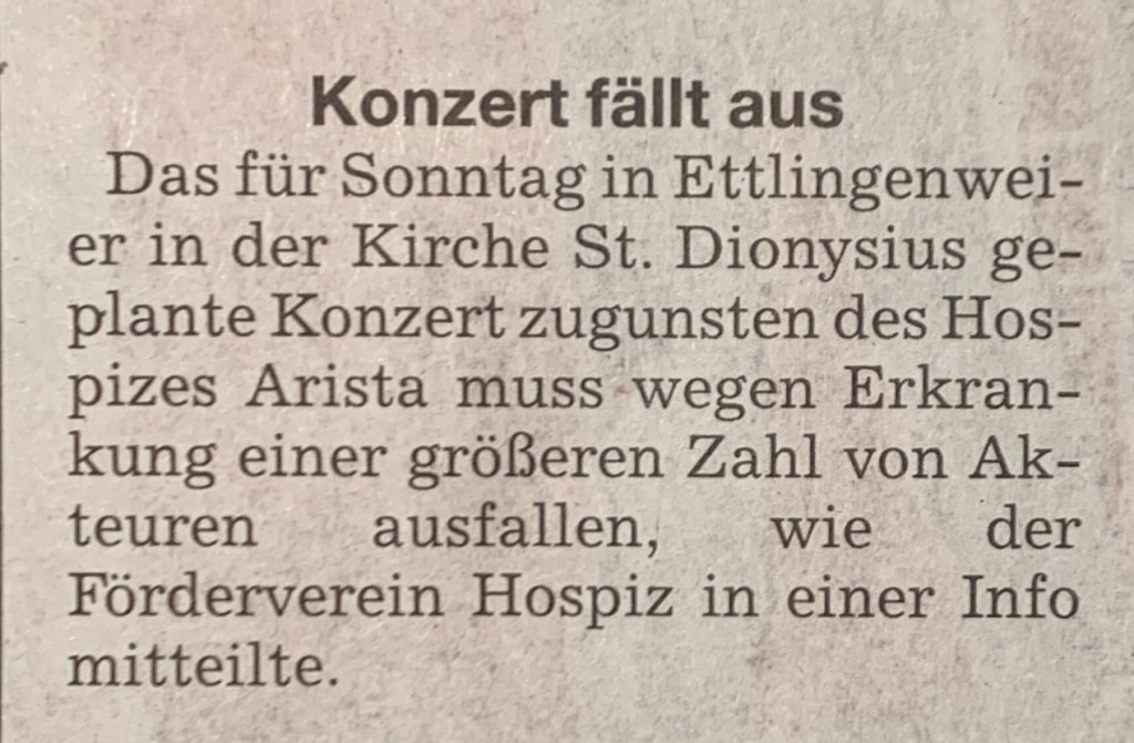 ADVENTSHOF AM SONNTAG Dezember 9, 2022Dezember 9, 2022 weierbloggt Das in unseren Adventskalender für kommenden Sonntag aufgenommene Konzert „Zauber der Chormusik“ fällt wegen Krankheit vieler Akteure leider aus. Teilen mit: Klicke, um auf X zu teilen (Wird in neuem Fenster geöffnet) X Klick, um auf Facebook zu teilen (Wird in neuem Fenster geöffnet) Facebook Gefällt mir Wird geladen … Ähnliche Beiträge Veröffentlicht von weierbloggt Zeige alle Beiträge von weierbloggt