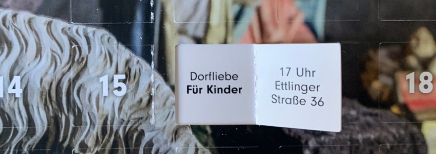 ADVENTSHÖFE Dezember 16, 2022 weierbloggt Was versteckt sich hinter dem 16. Türchen? Ein Schattenspiel der Dorfliebe über einen kleinen Tannenbaum für kleinere Kinder (so ungefähr Kindergarten bis 2. Klasse) im Hof der Ettlinger Straße 36 Teilen mit: Klicke, um auf X zu teilen (Wird in neuem Fenster geöffnet) X Klick, um auf Facebook zu teilen (Wird in neuem Fenster geöffnet) Facebook Gefällt mir Wird geladen … Ähnliche Beiträge Veröffentlicht von weierbloggt Zeige alle Beiträge von weierbloggt