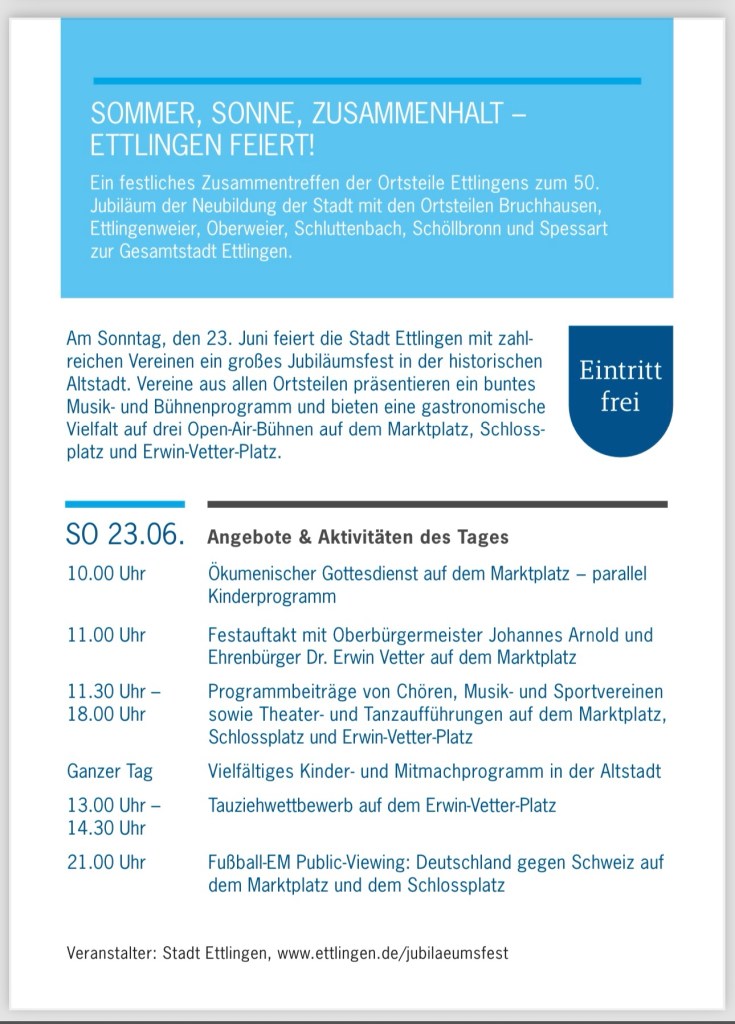 Wer es noch nicht gelesen hat: am kommenden Sonntag feiern wir zusammen mit der Stadt und allen Ortsteilen 50 Jahre Ettlingen. Die Vereine aus Ettlingenweier engagieren sich auf dem „Erwin“ (Erwin-Vetter-Platz).