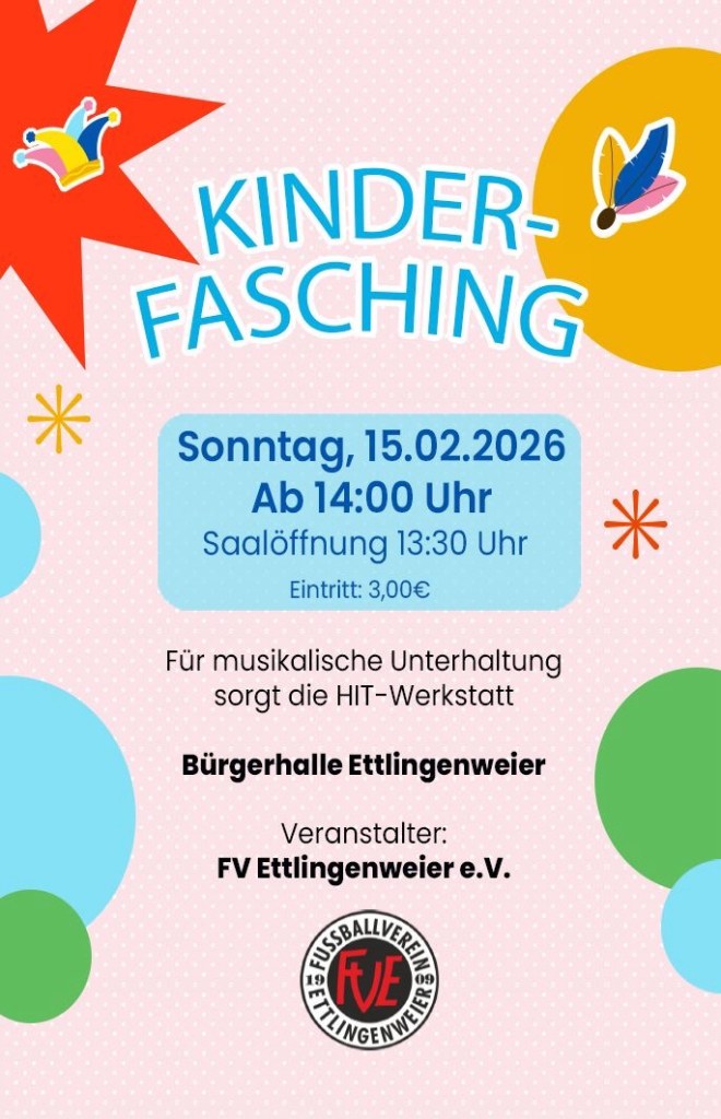 Der FV Ettlingenweier organisiert für Euch wieder unseren beliebten Kinderfasching in der Bürgerhalle Ettlingenweier.